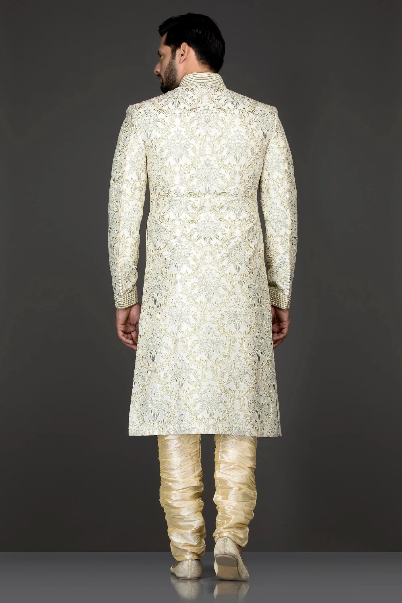 Ivory Colour Silk Sherwani With Silver Zari And Dori Embroidery Paired With Gold Bottoms