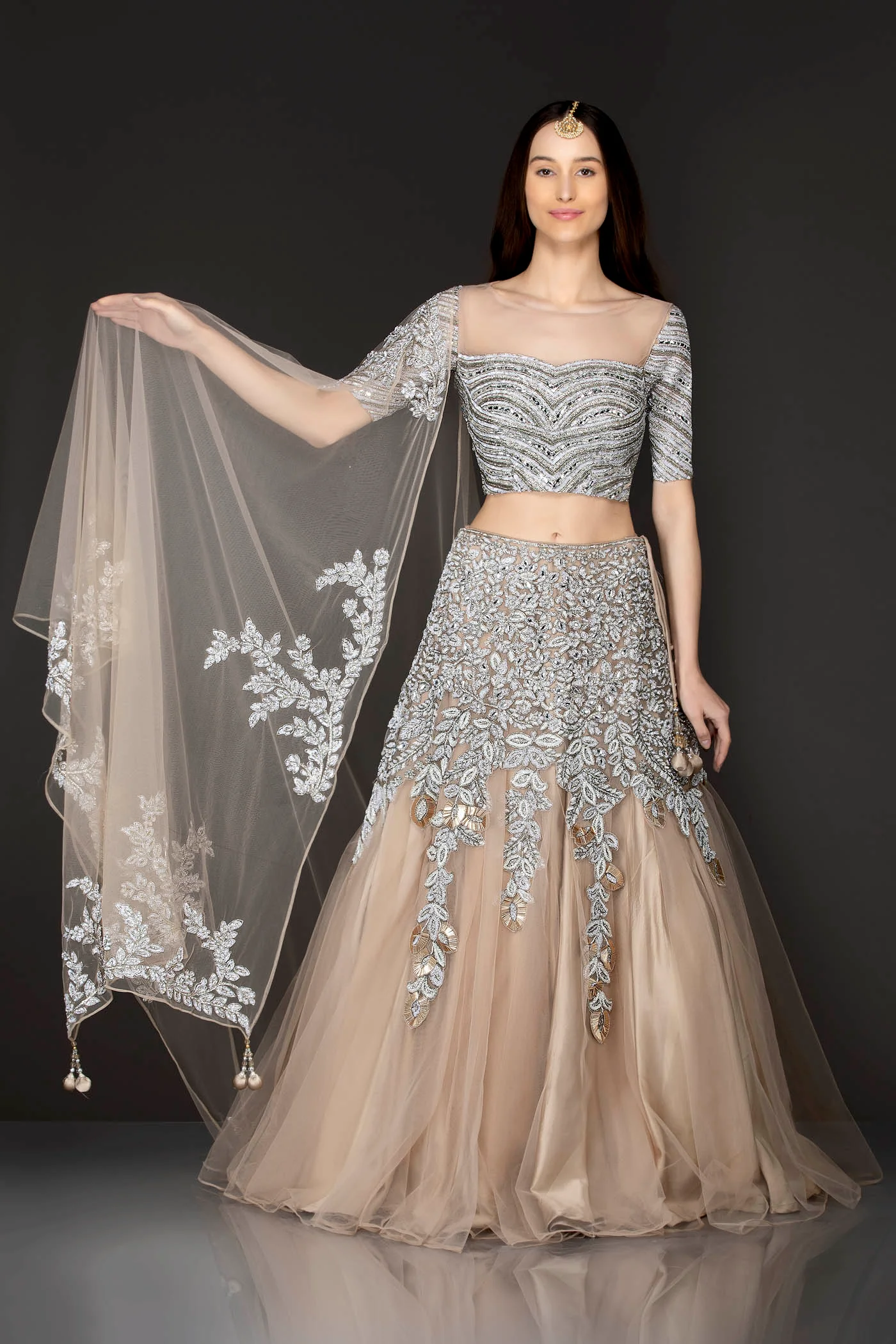 Beige Gold Net Skirt Top With Heavy Embellishment of Thread/Badla/Stone work